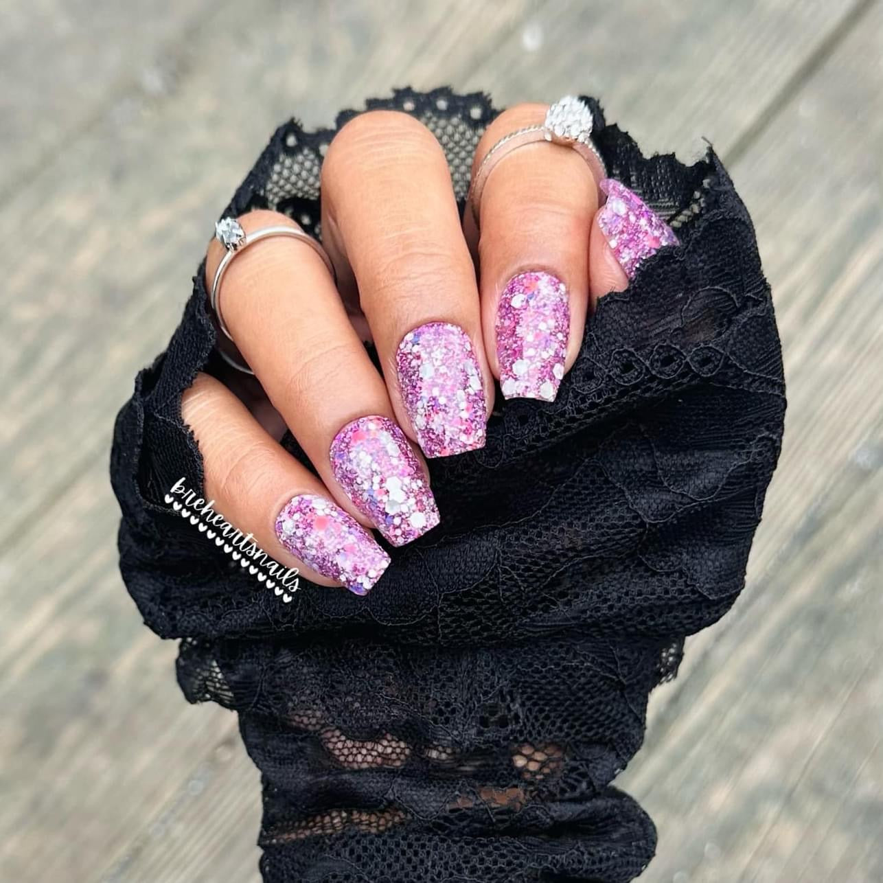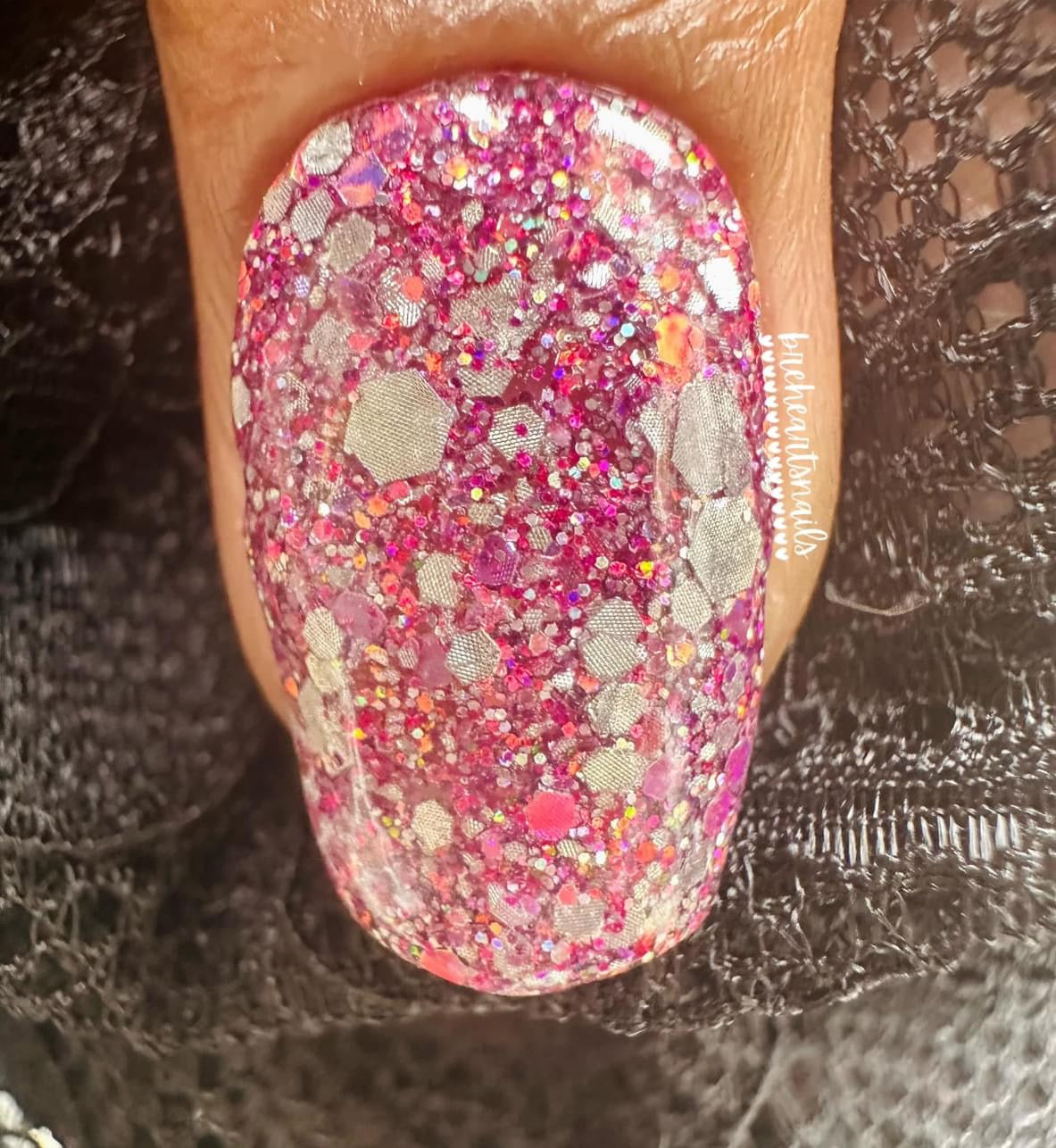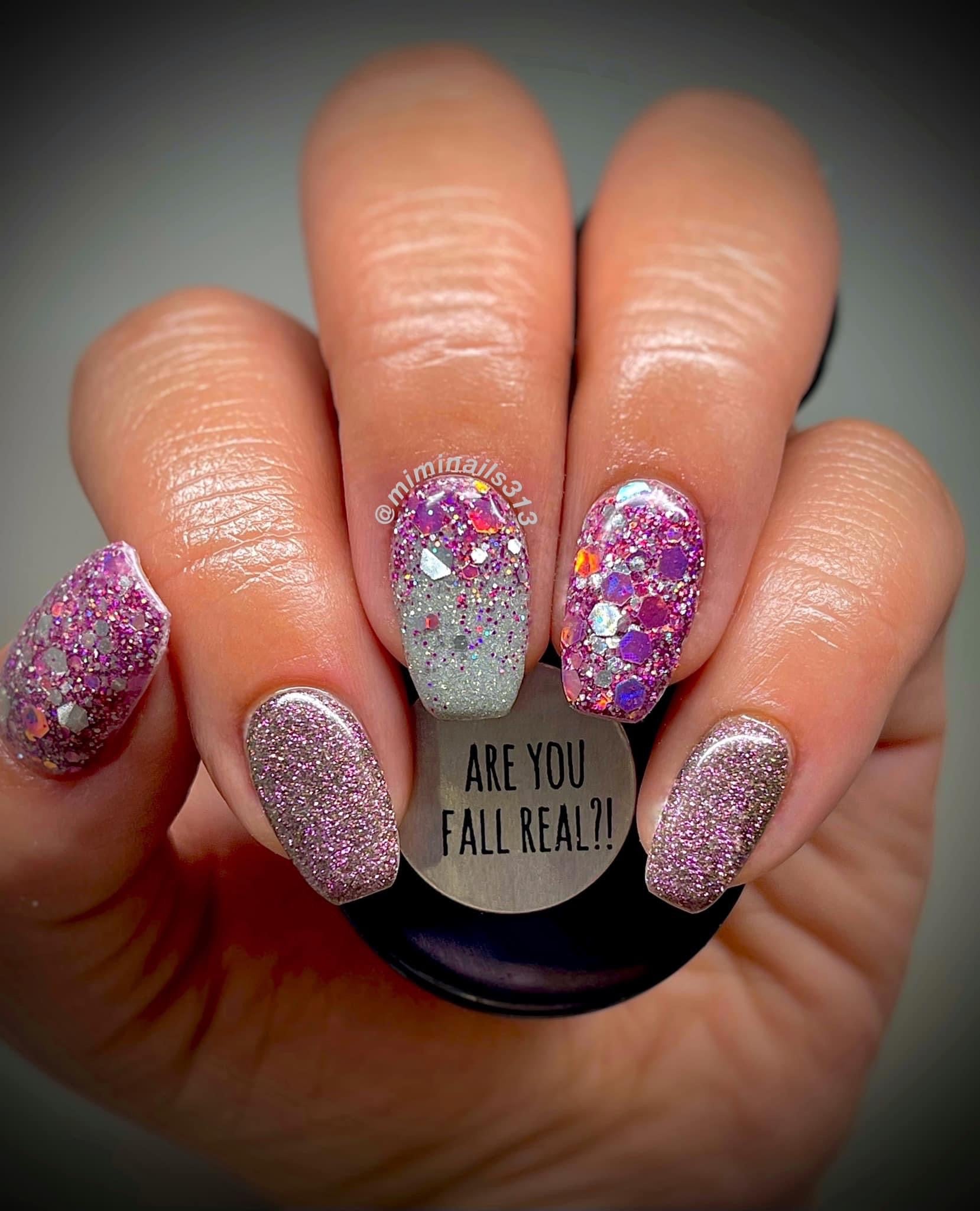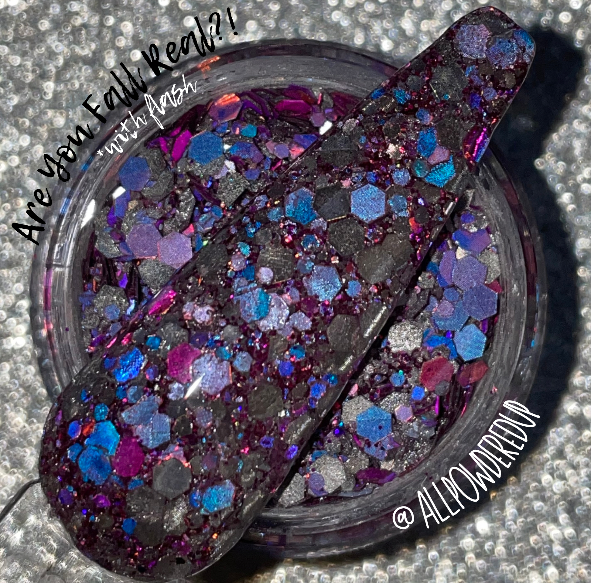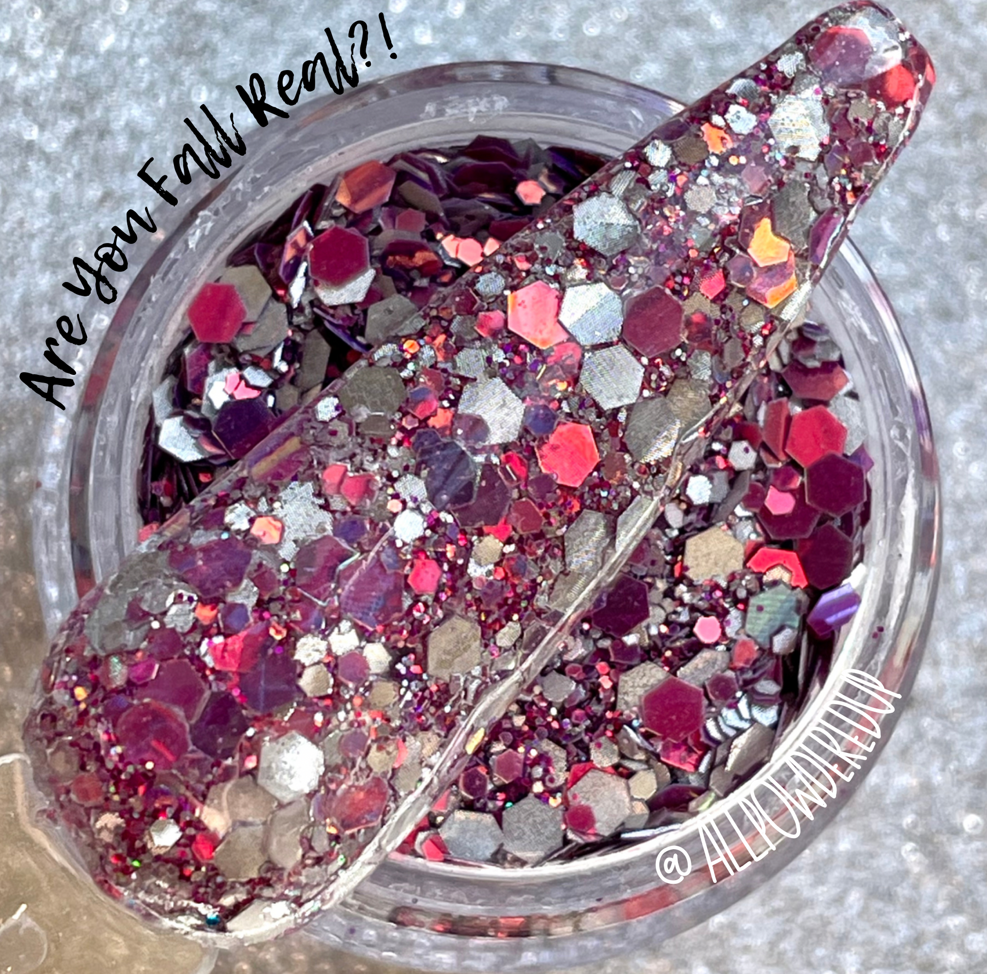 Are You Fall Real?! is a reflective chunky glitter mix. It appears more silvery/pinky red and then with flash shows blue!