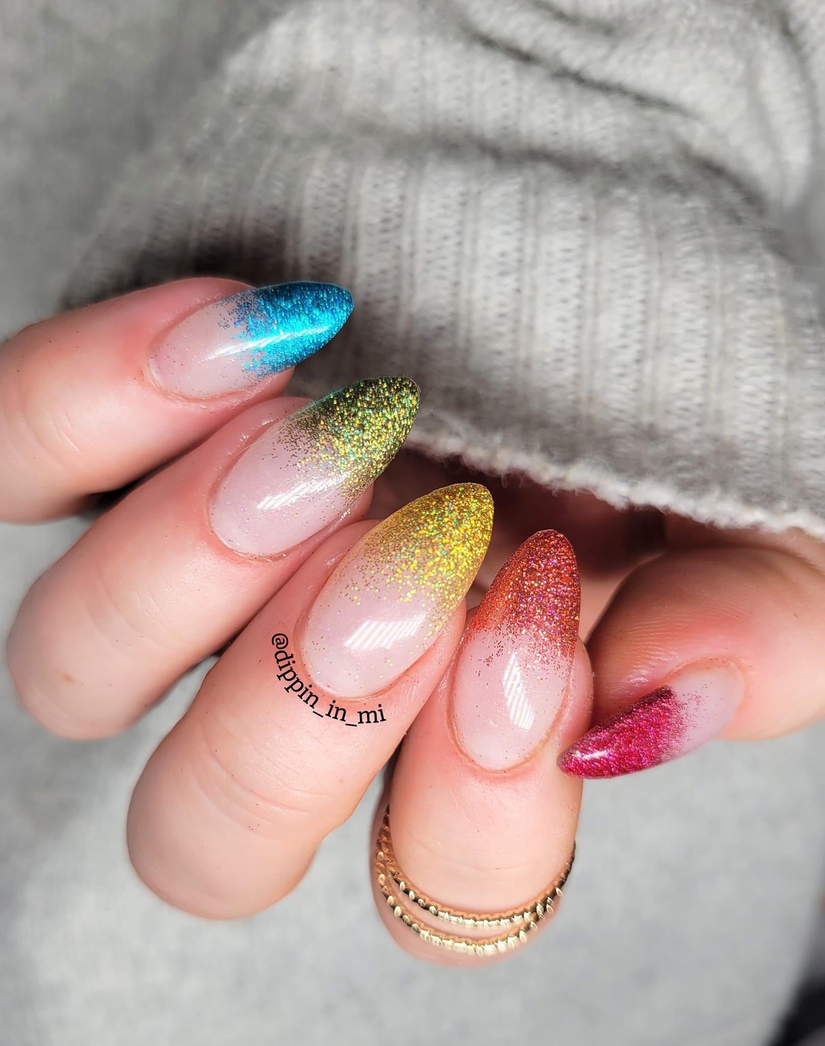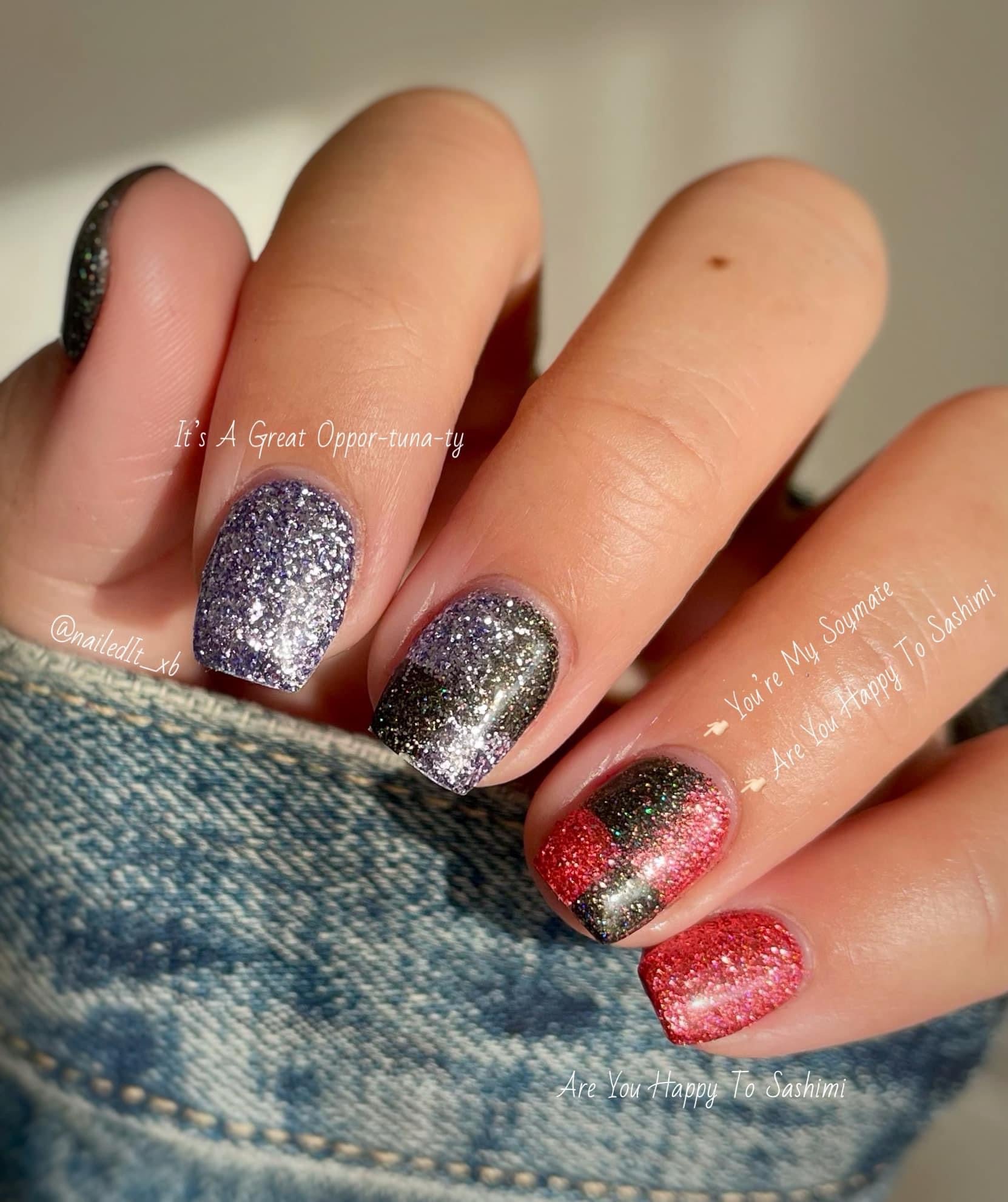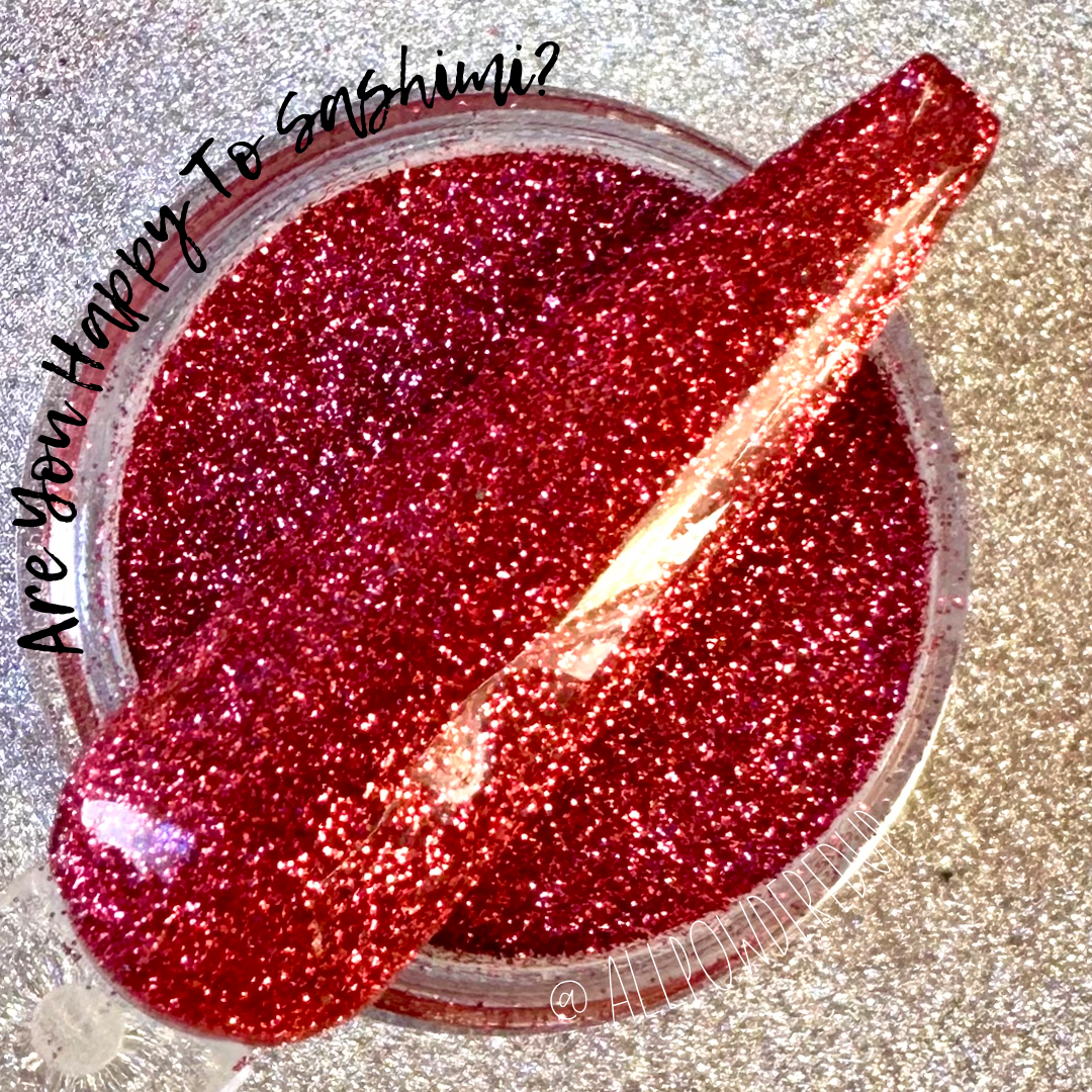 Are You Happy To Sashimi? is an ultra fine, bright, pinkish orangish holographic glitter dip.