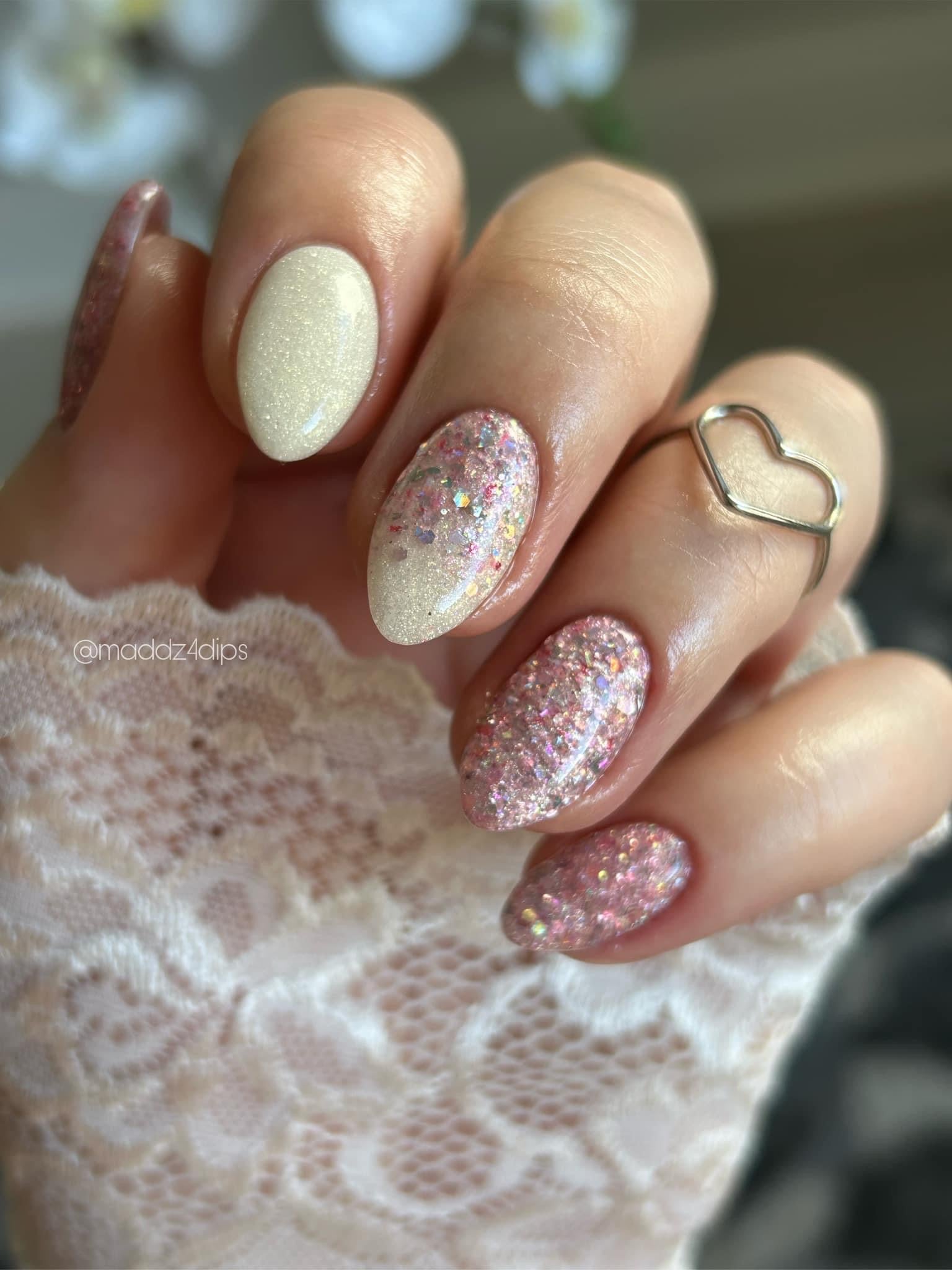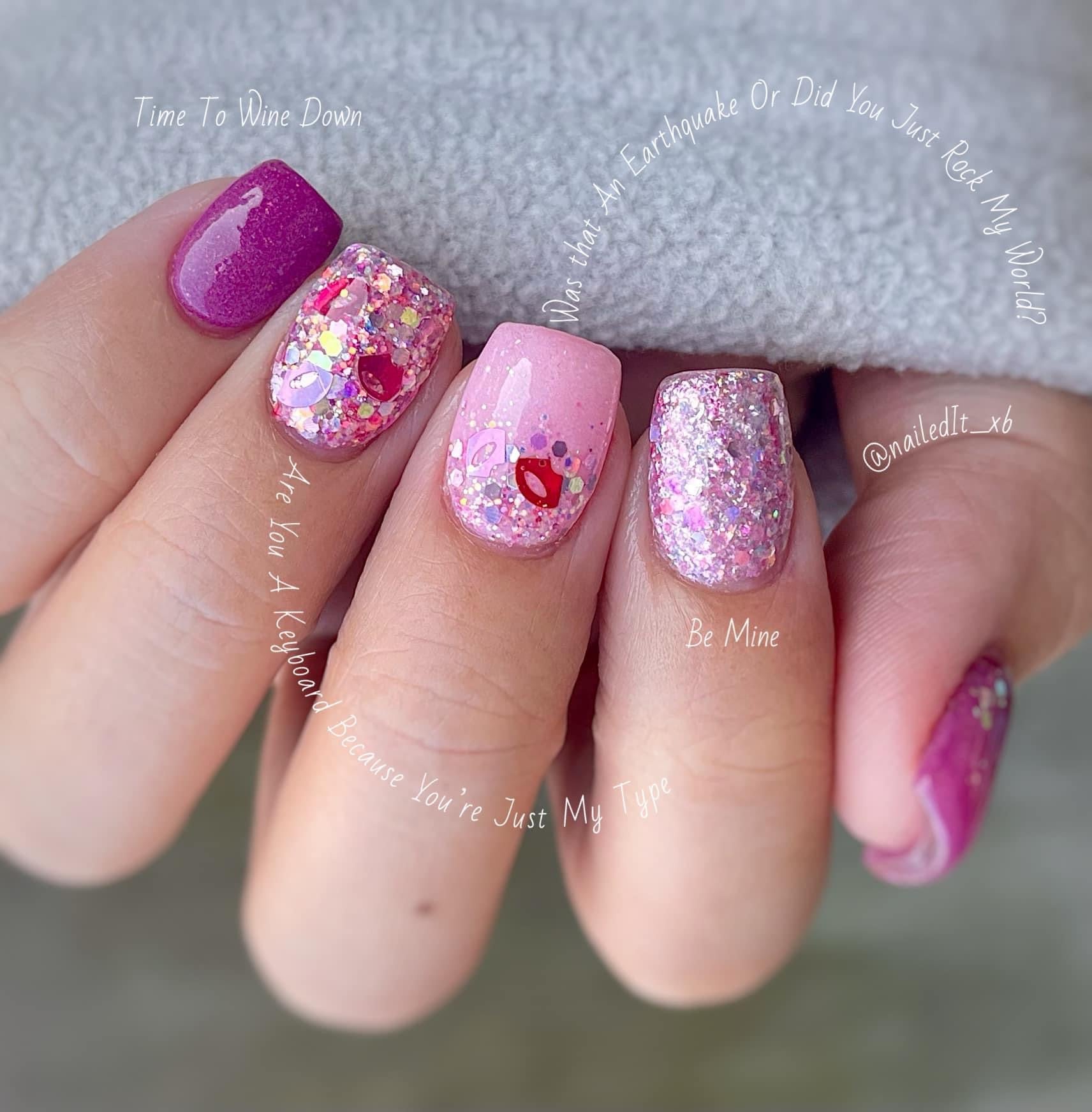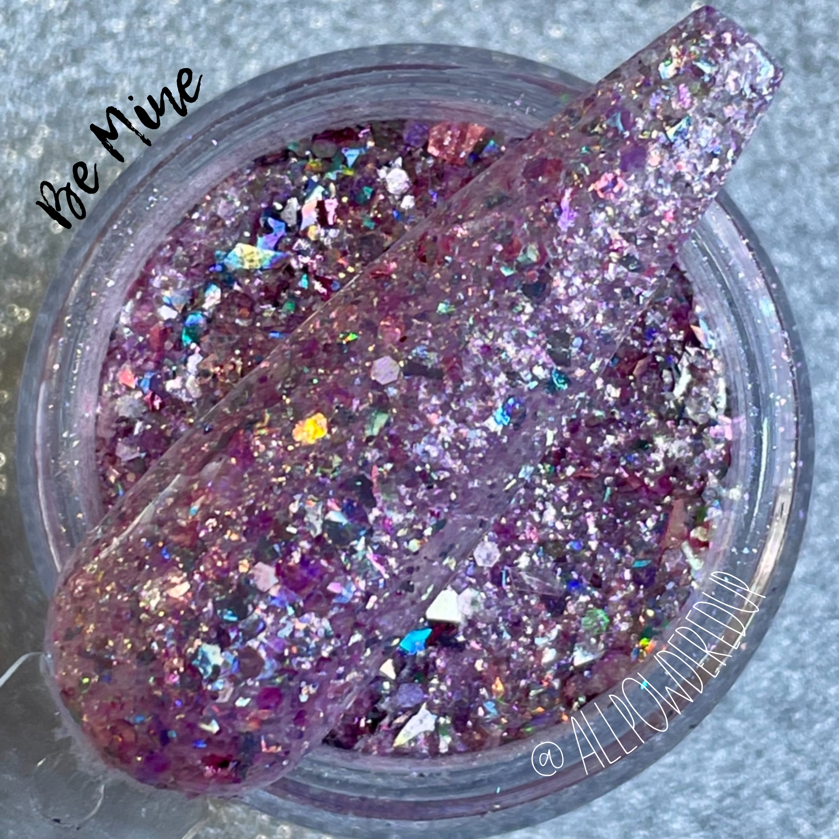 Be Mine has multiple shades of baby flakes to create a light pink baby flake base. There are added silver holo flakes and iridescent glitters to make this pop!