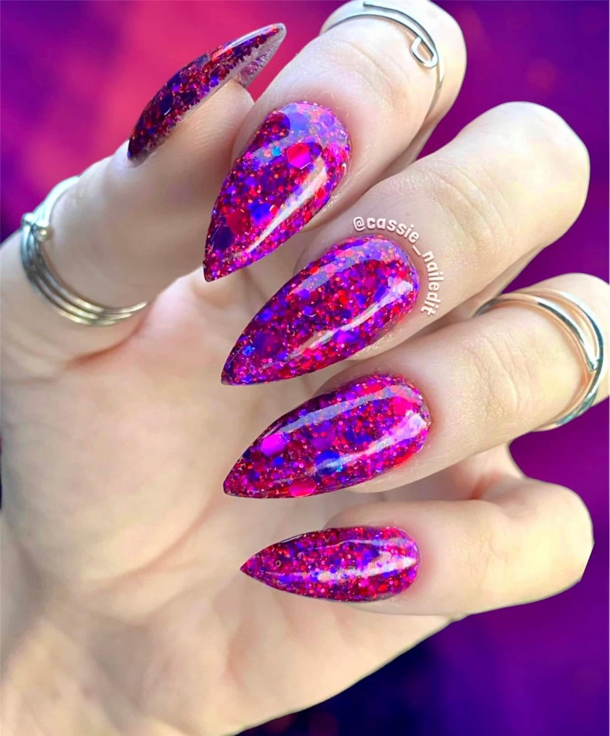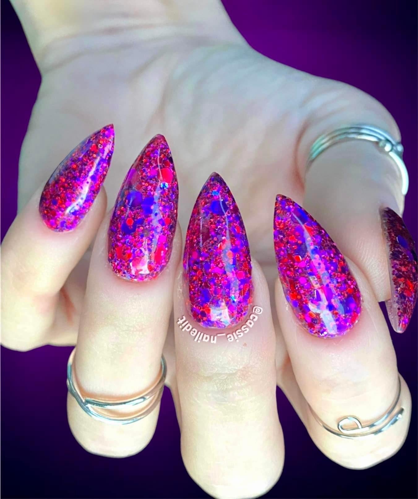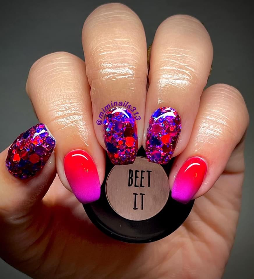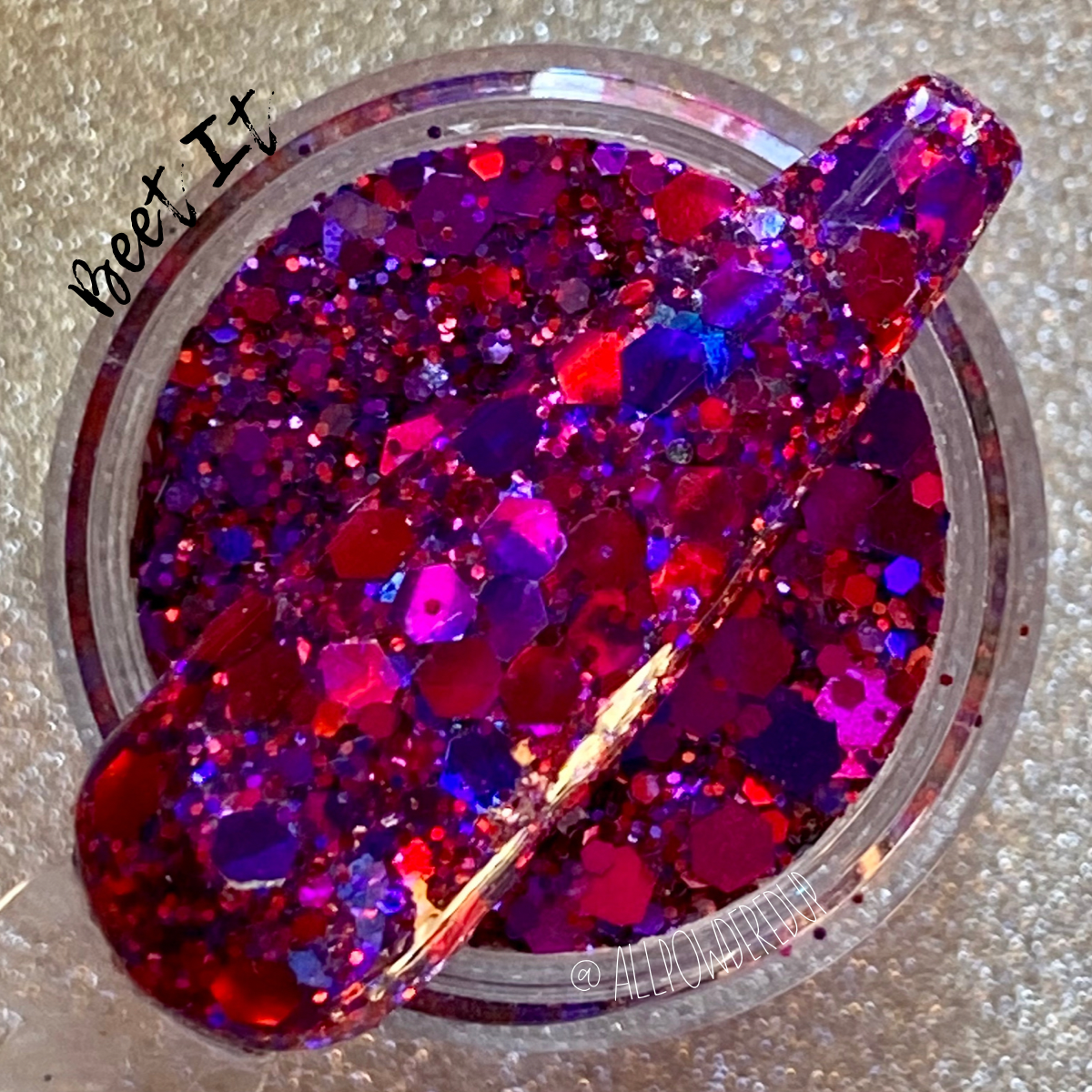 Beet It has a gorgeous combination of reddish pink and purple elements. The shift and dimension in this one is outrageous!!