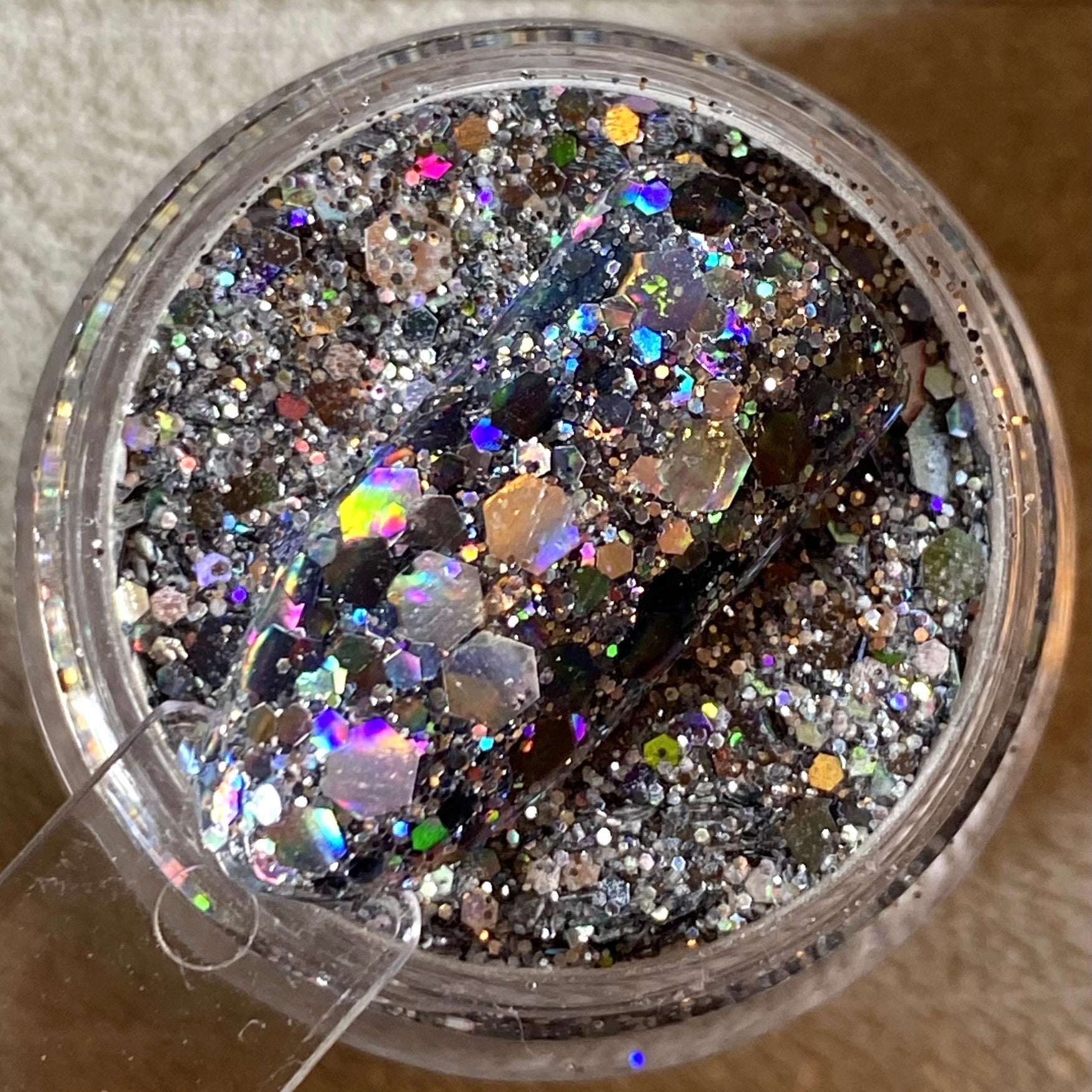 Better Safe Than Starry is a combination of silver and a dark charcoal holographic elements. As this shifts in the light pink and aqua reflections are noted.