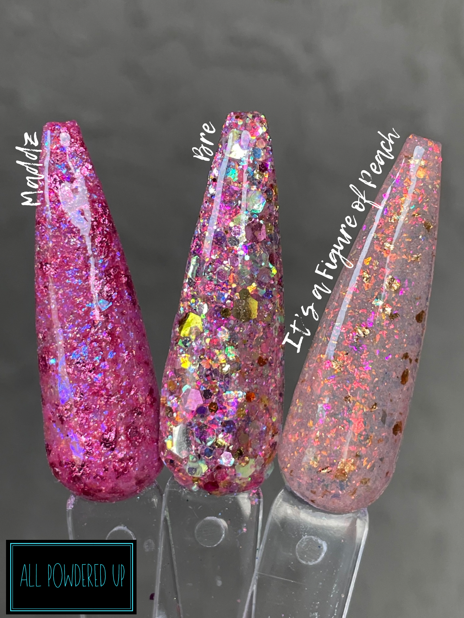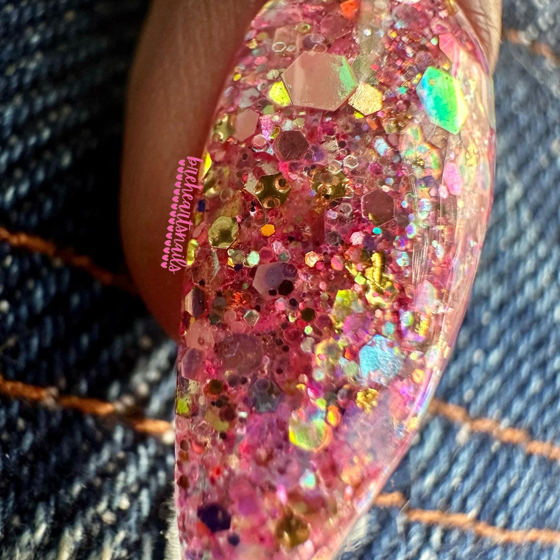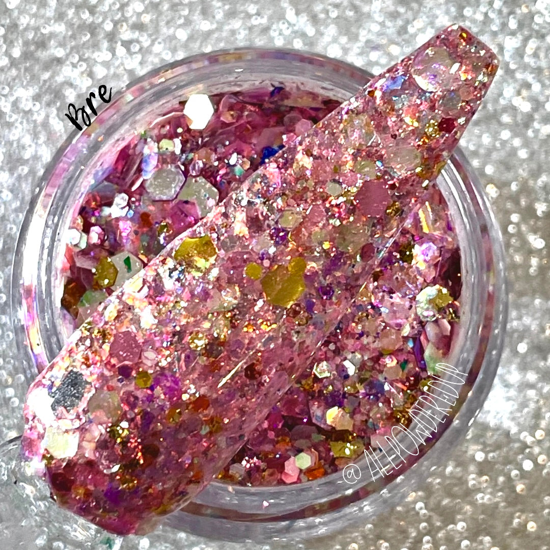 Bre is the epitome of our pal Bre. It has all the pinks, a little purple, flakes and flakes and a little gold foil.