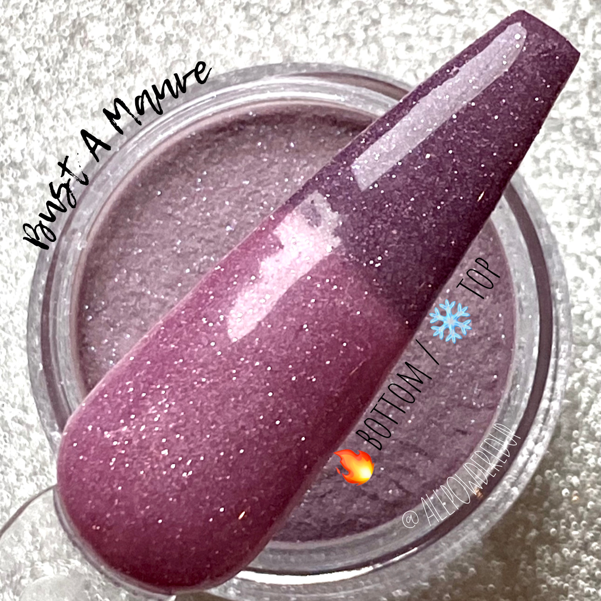 Bust A Mauve is a shimmery thermal that is mauve when warm and turns to a dusty purple when cold.