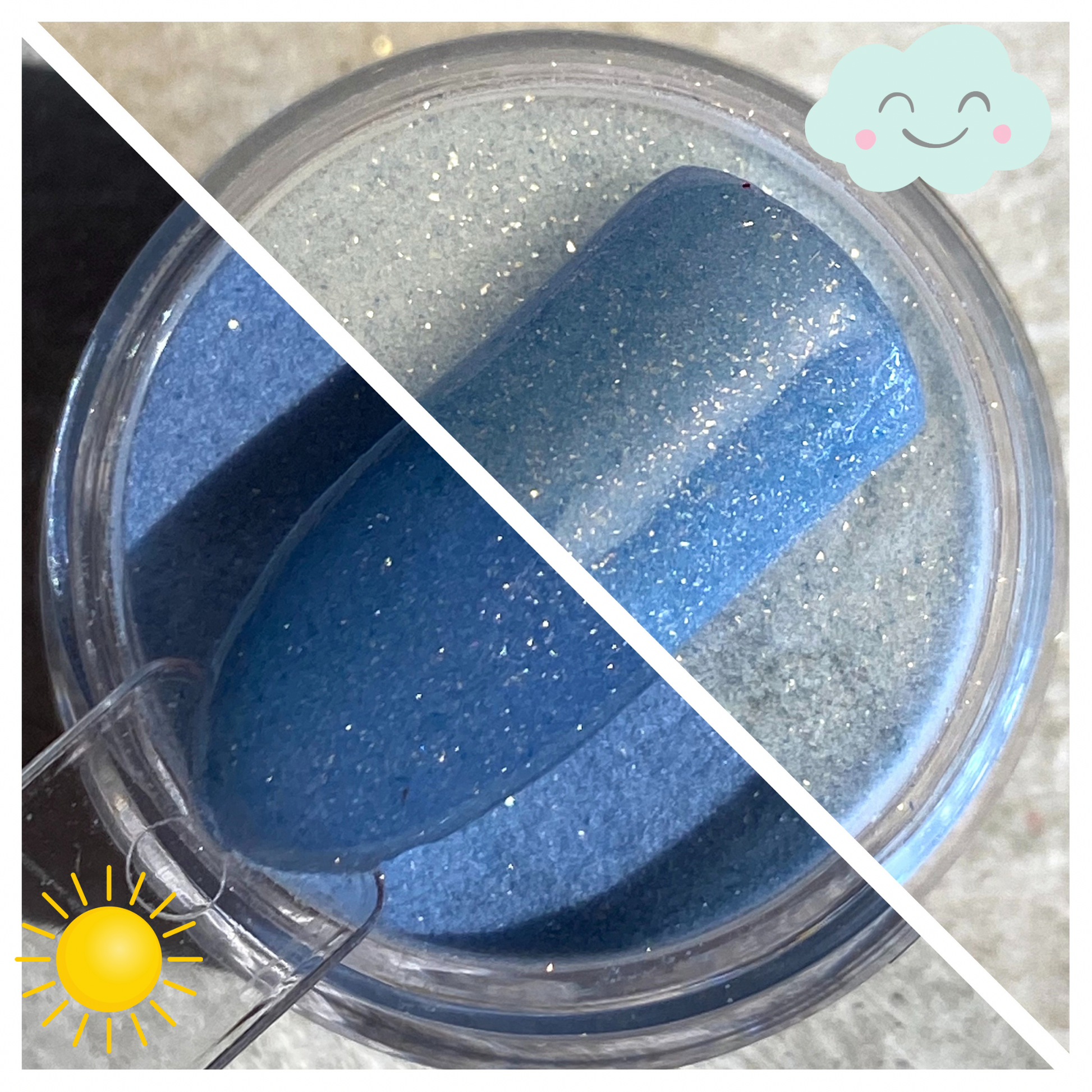 Cloud And Clear is a blue with the prettiest added gold shimmer. In the sun she changes to a deeper blue that pulls purple.