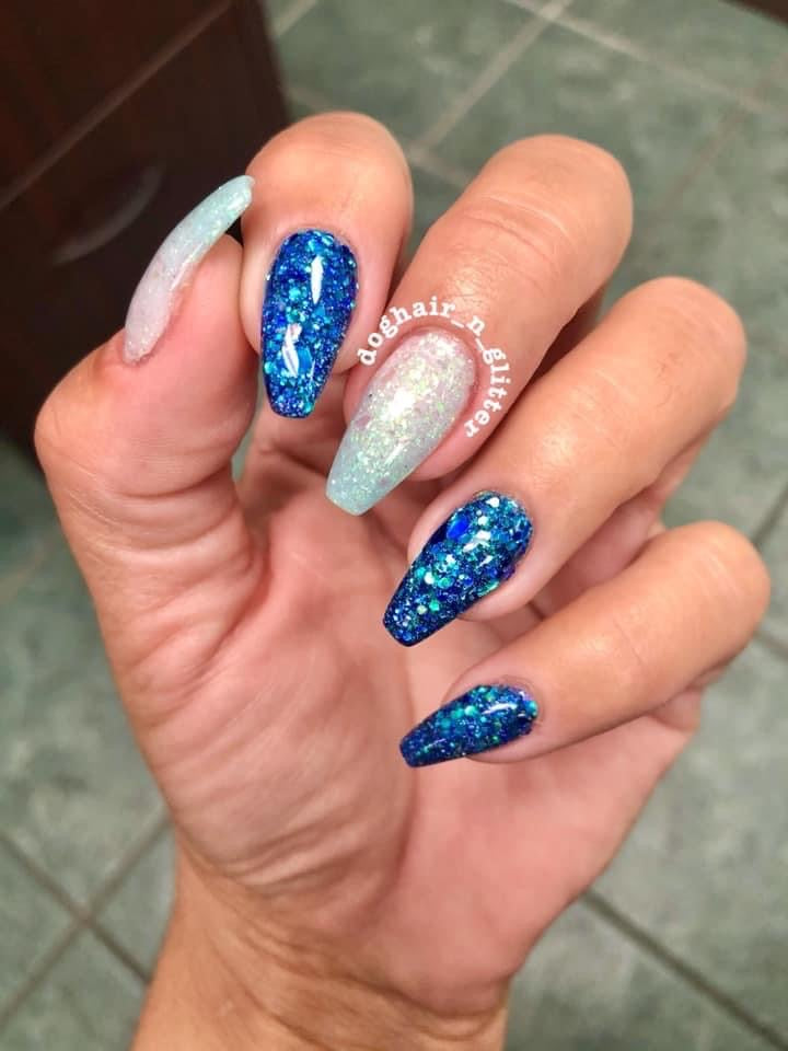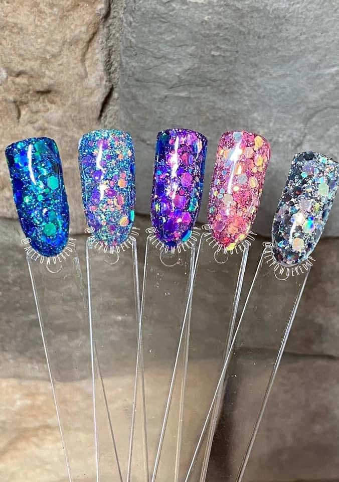 Fanta-Sea has multiple shades of blue and teal for a base with chunkier elements that shift between a blue and greenish shade.