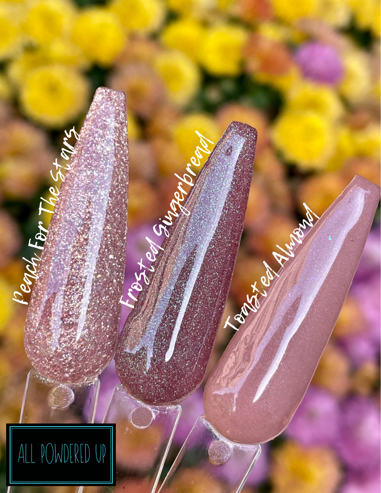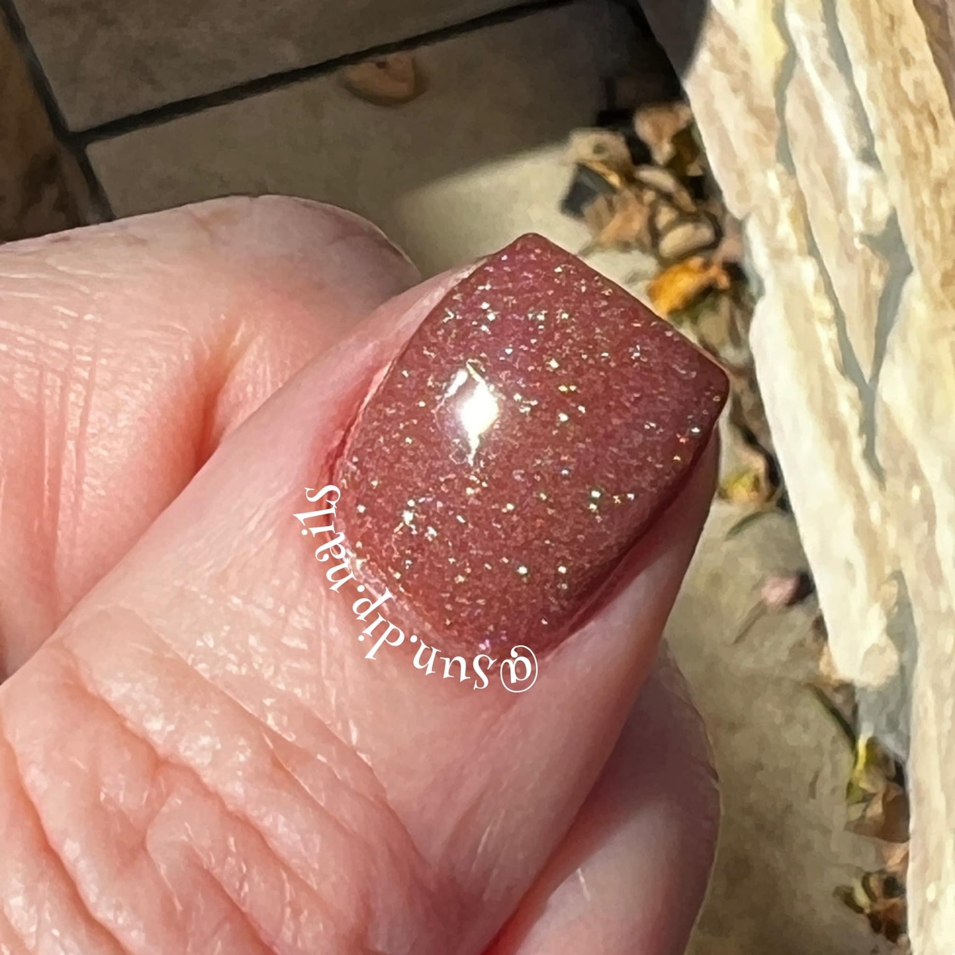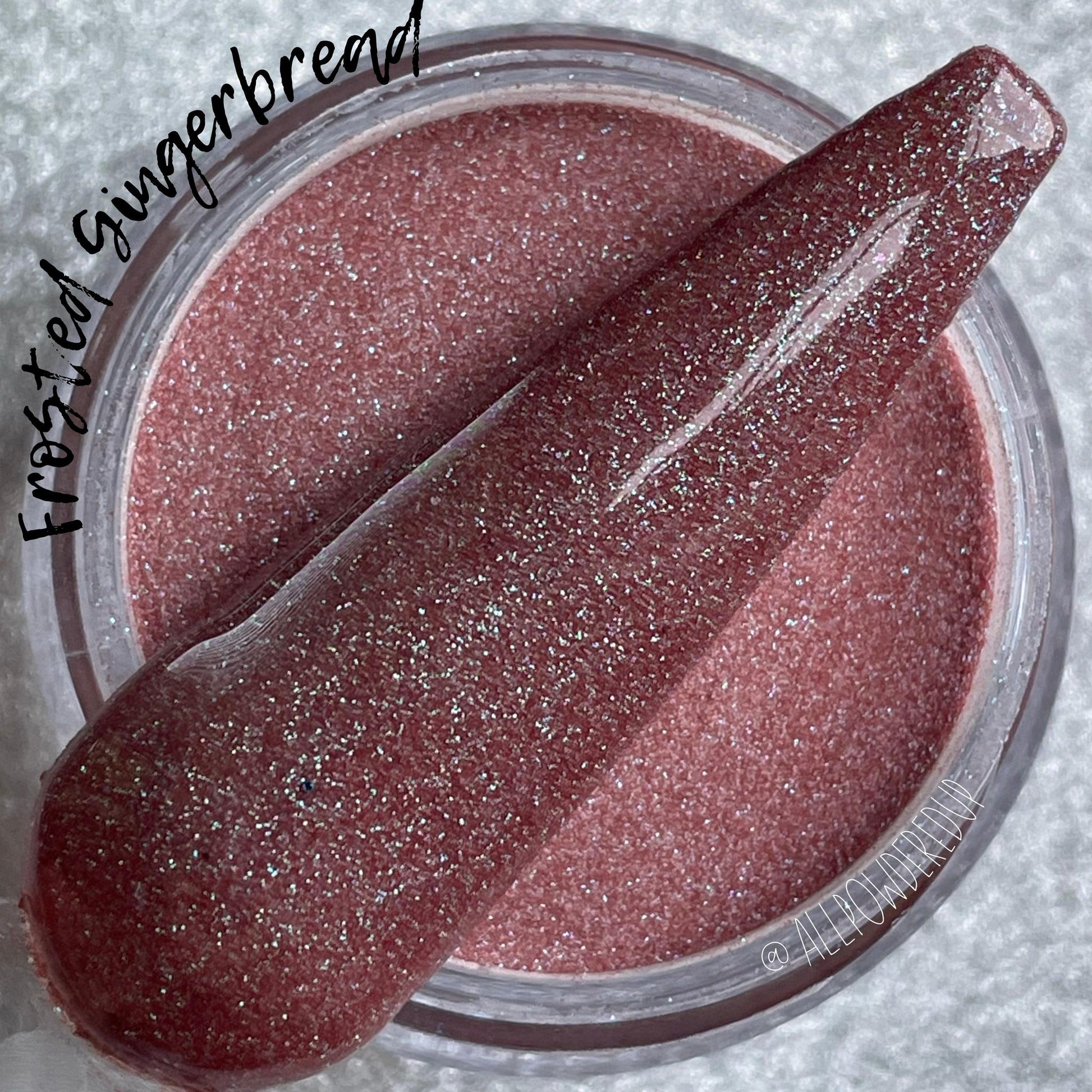 Frosted Gingerbread is a warmer neutralish brown packed with greenish blue chameleon shimmer.