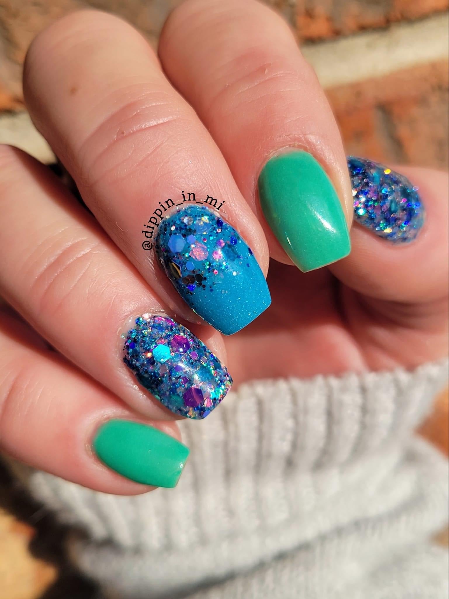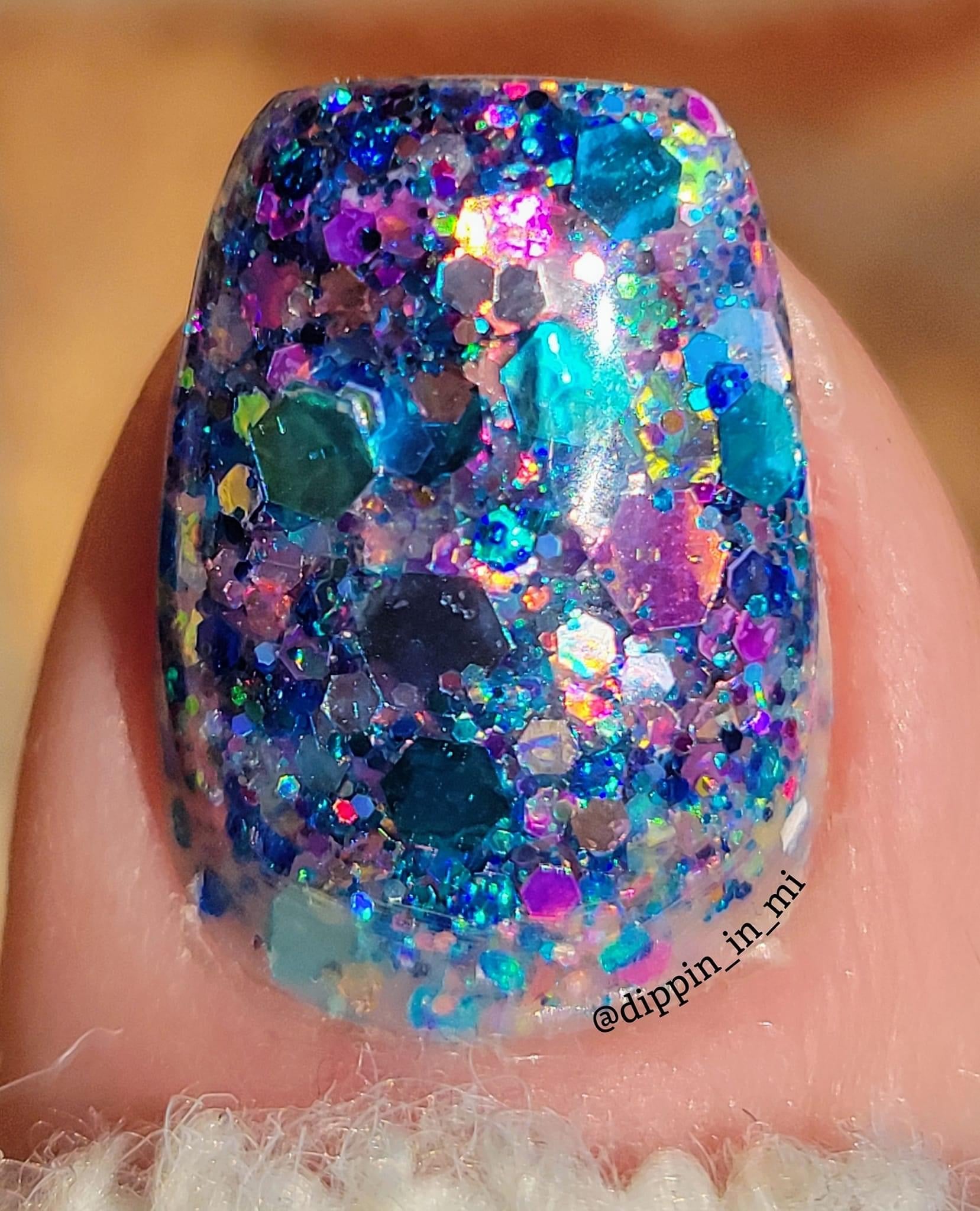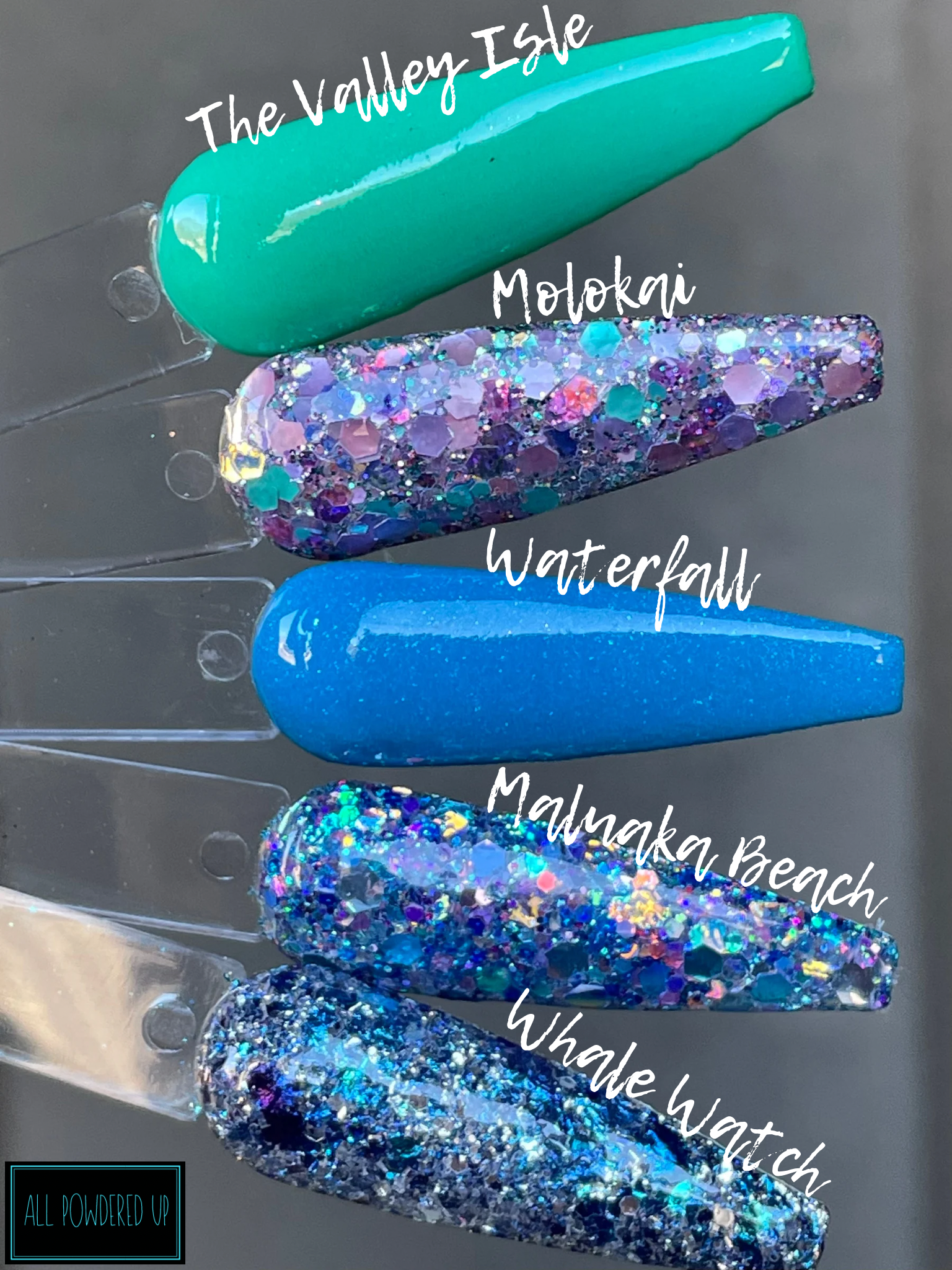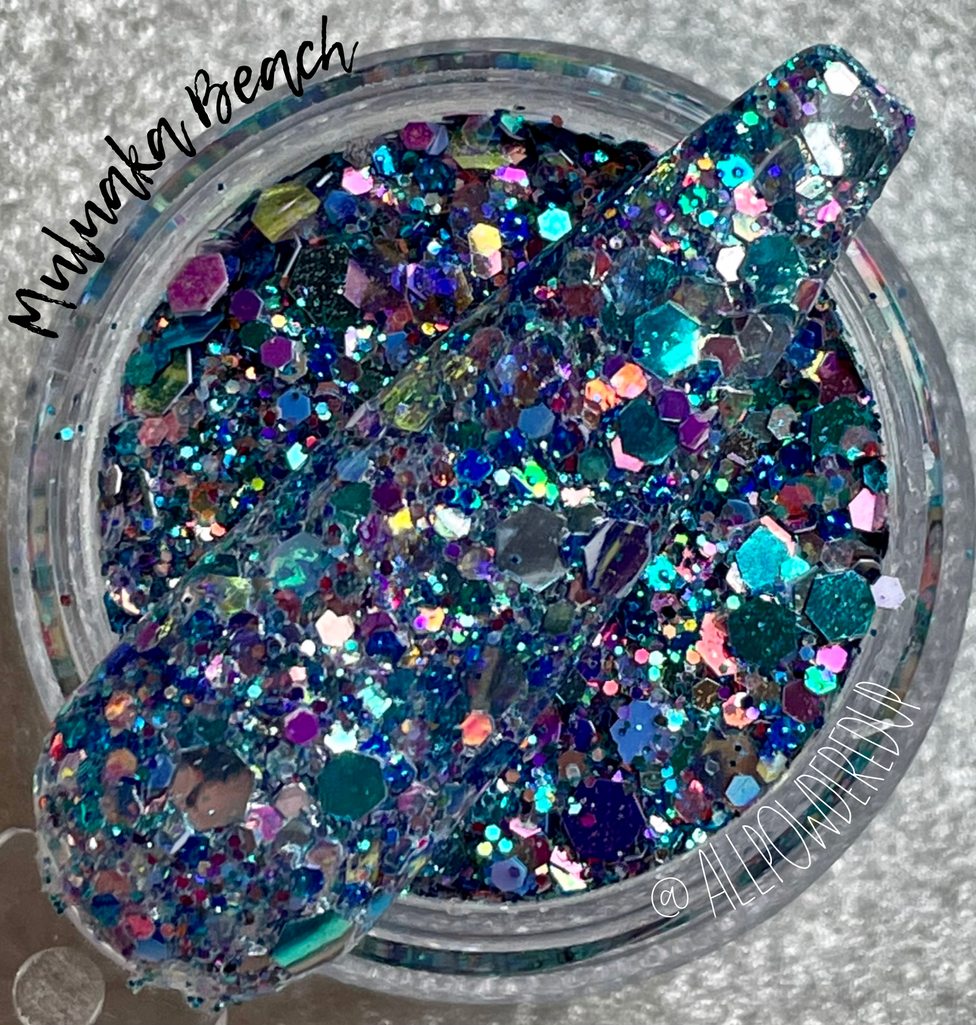 Maluaka Beach has a base of multiple blues and a tiny bit of purple. There’s a variety of smaller and large chunkies that are shifty, iridescent, metallic or chameleon.