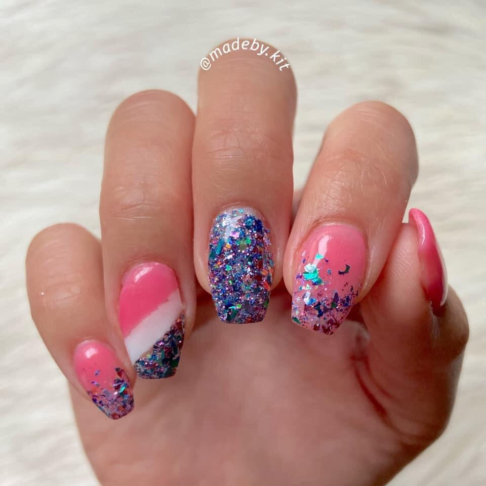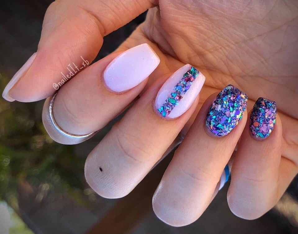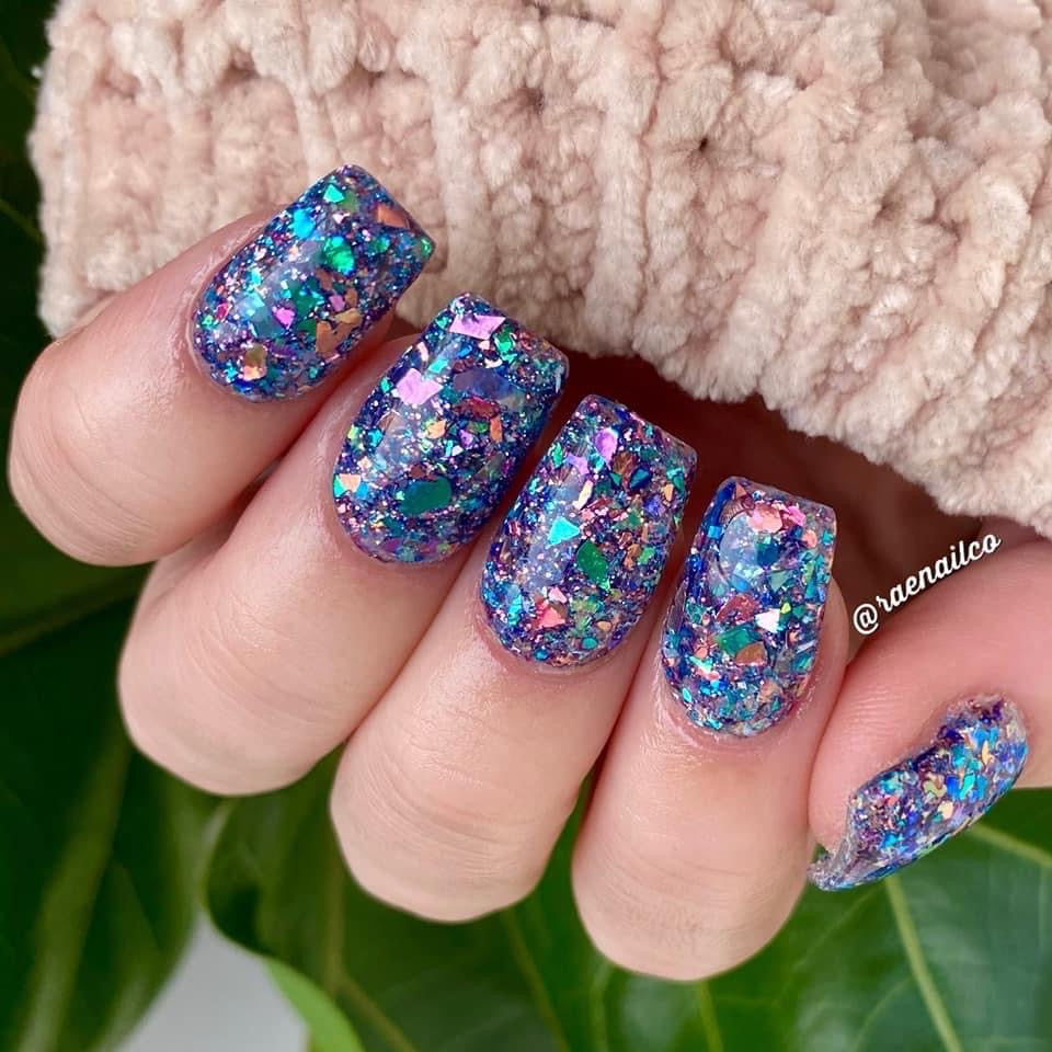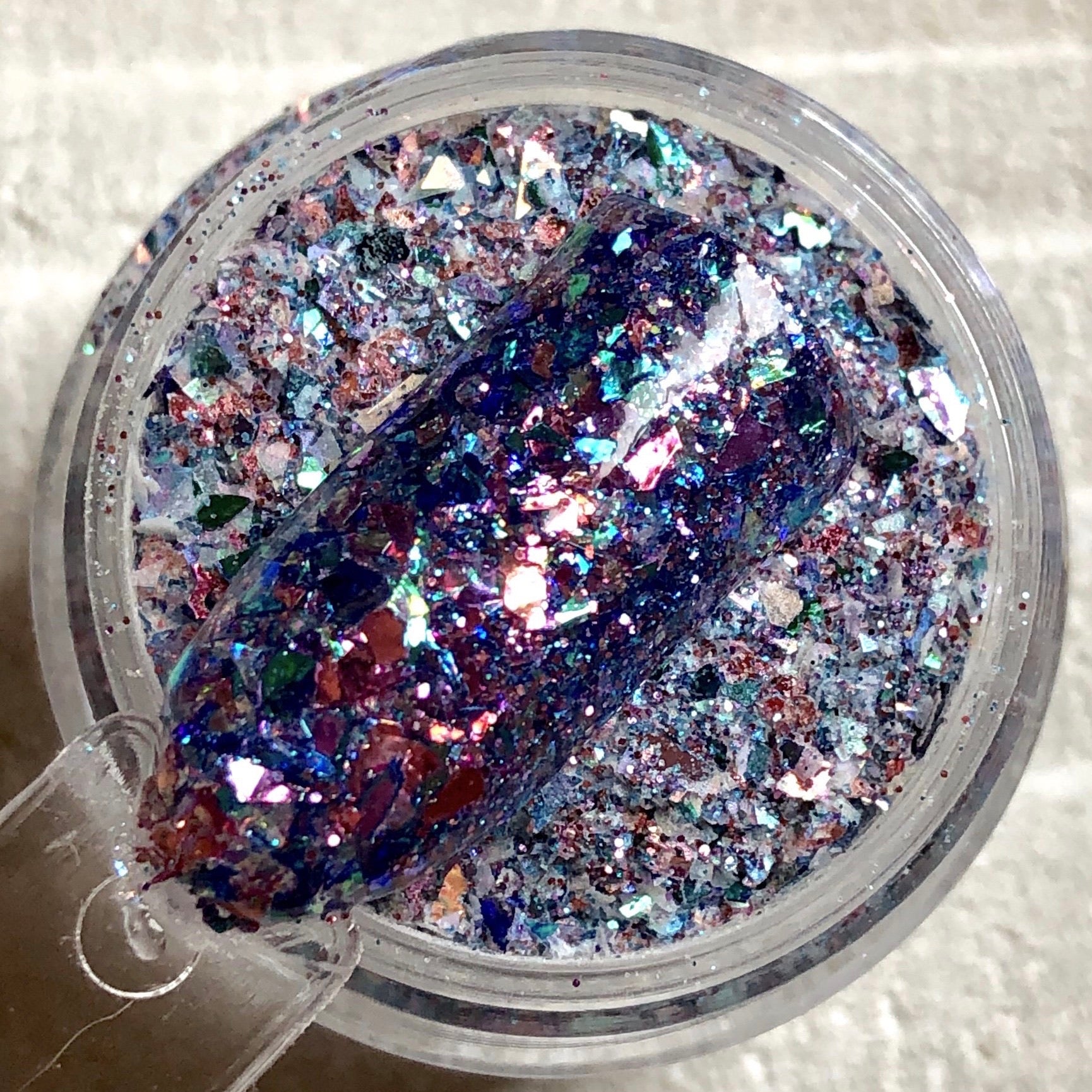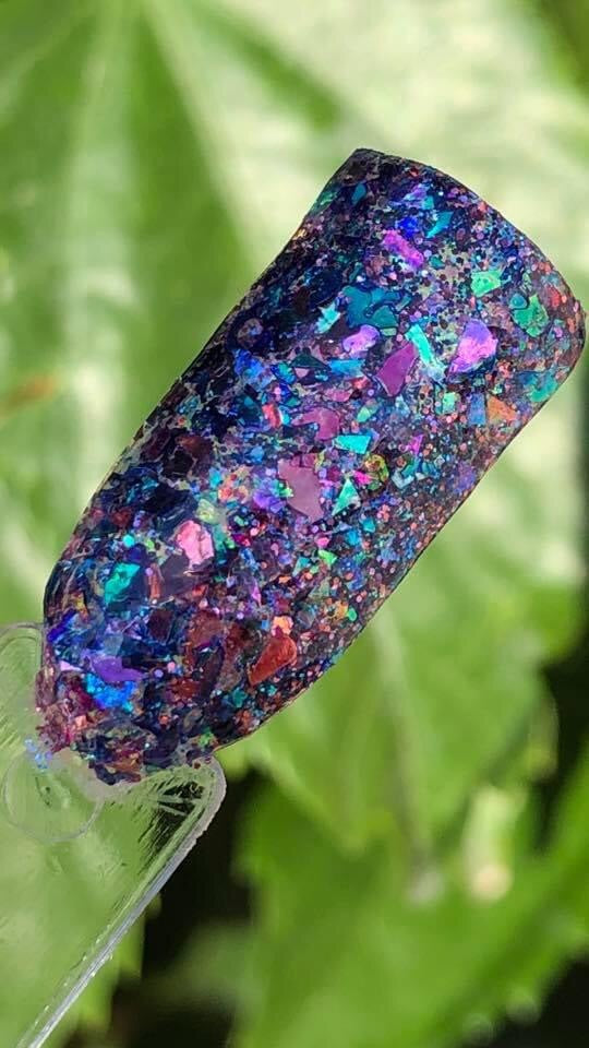 One In Chameleon has a mix of smaller glitters that are a bit darker for a more fallish feel. There are several different chameleon irregular shaped glitters for added depth and incredible shiftiness!
