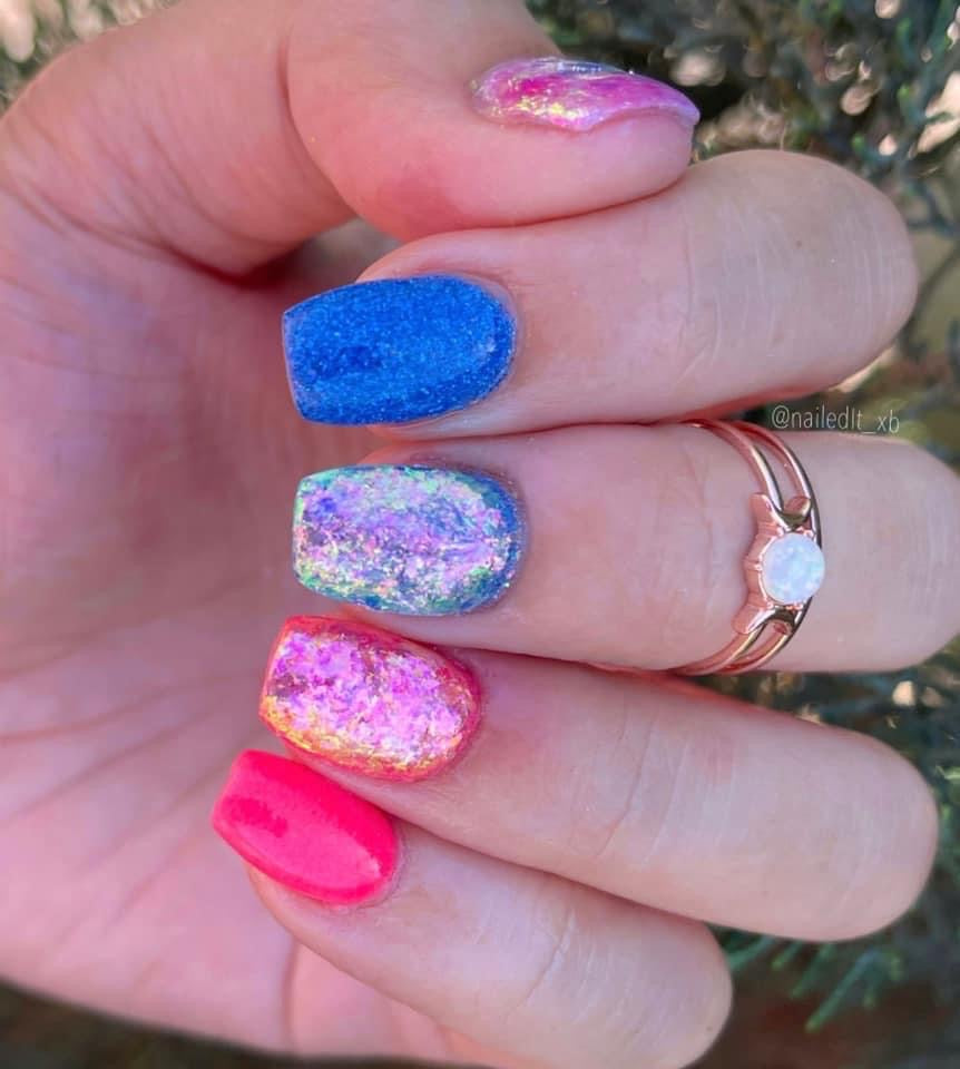 Pink Rainbow Flakes are the lightest flakes and are so easy to apply. They will “melt” into your dip base or gel and lay flat easily.