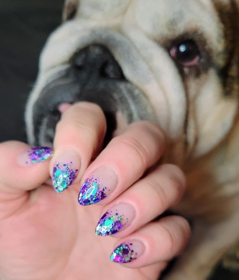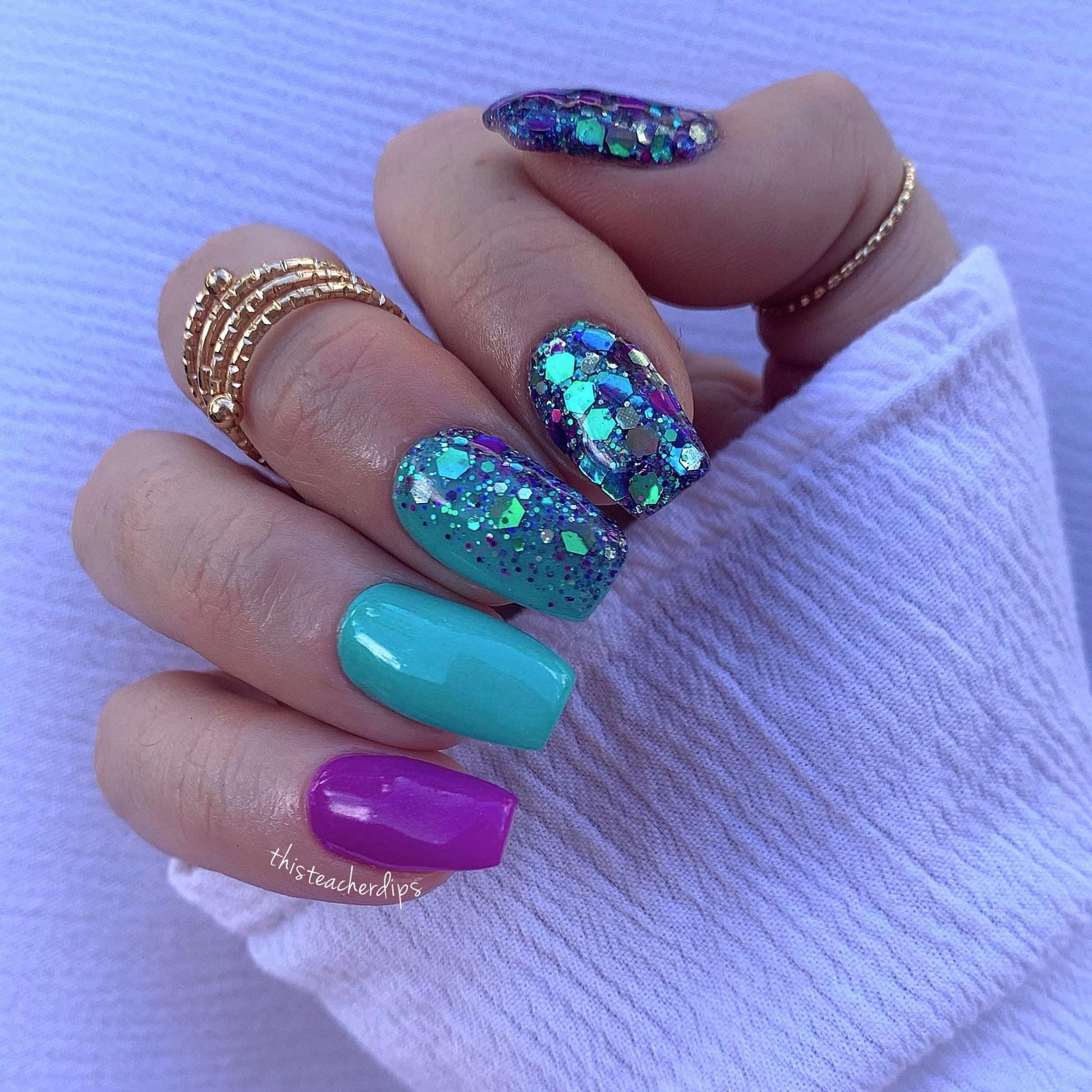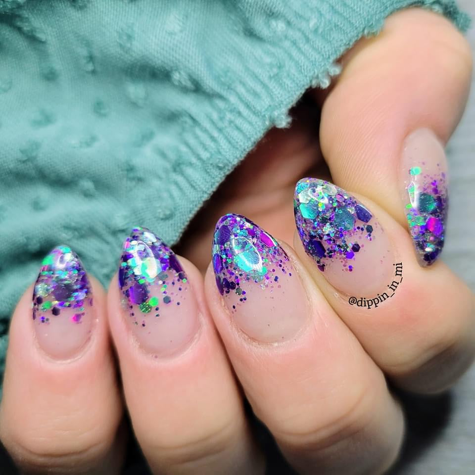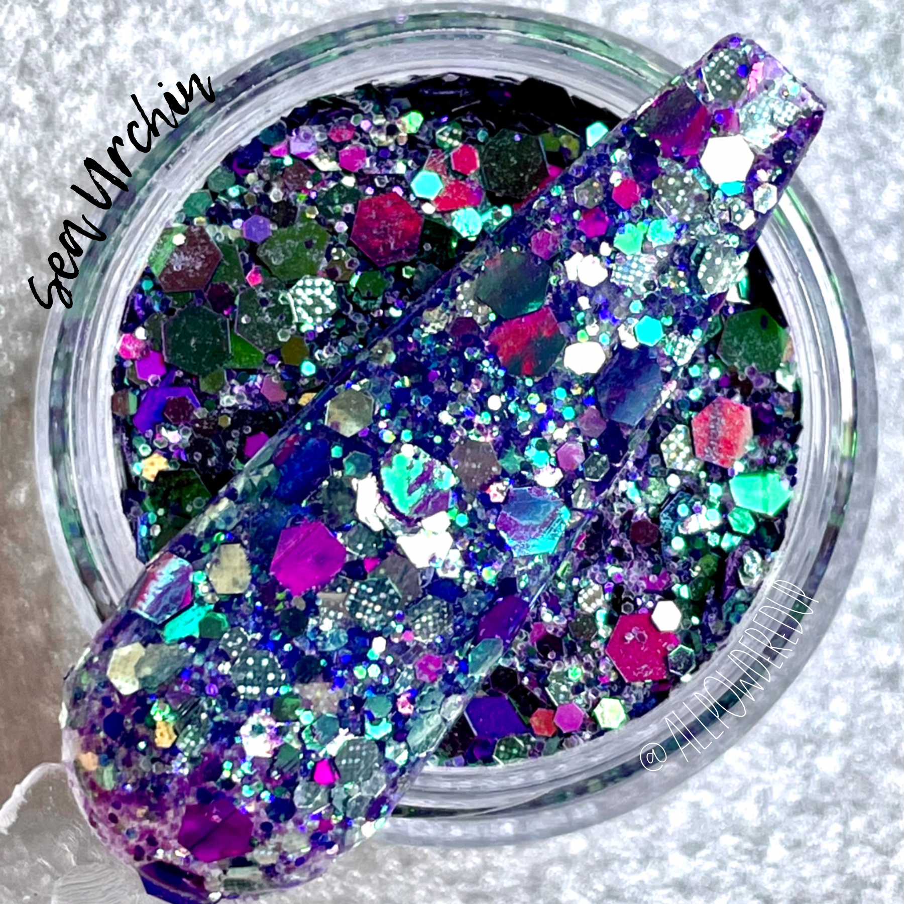 Sea Urchin has a purple and green iridescent base with added textured aloe colored chunkies, shifty purple to green and shifts of pink or blue.