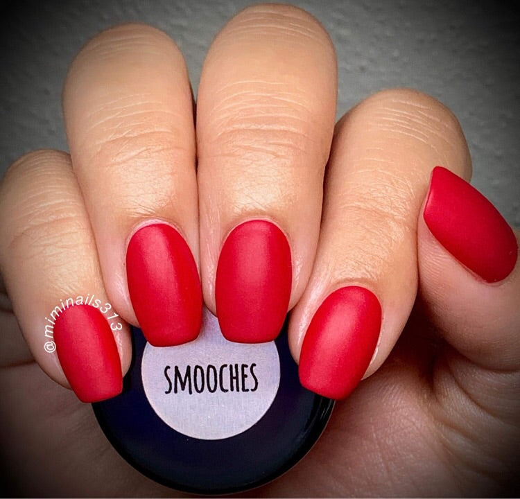 Smooches is a solid red (more blue red). In certain light on some skin tones it may lean a ever so slightly pink.