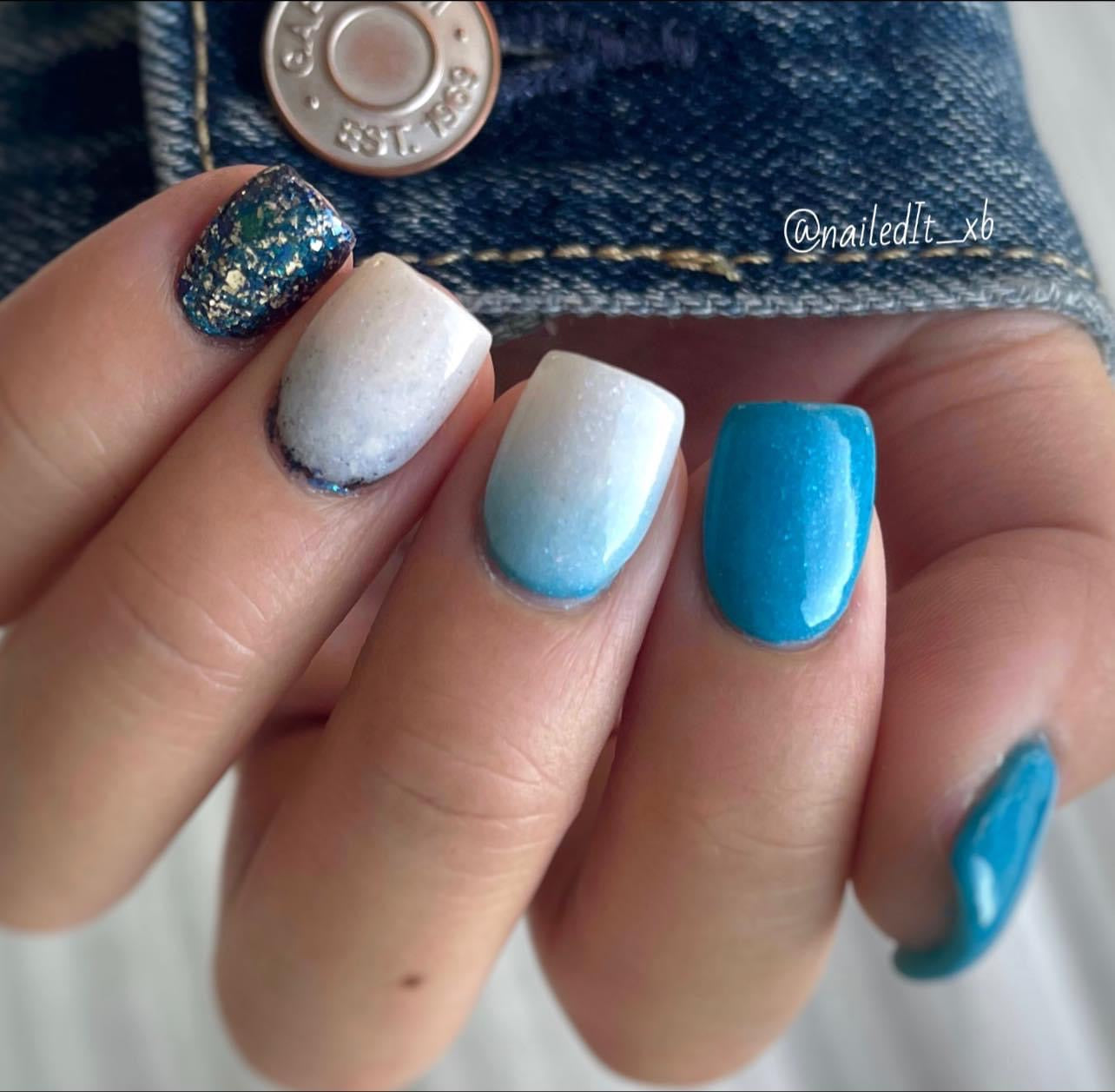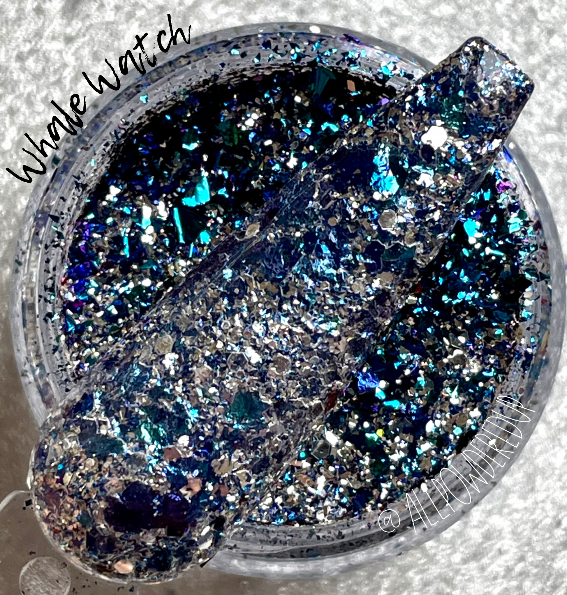 Whale Watch has a combination of fine and small chunky silver metallic and holographic glitters with some fine blues as well. The best part are the blue/purpleish chameleon flakes!
